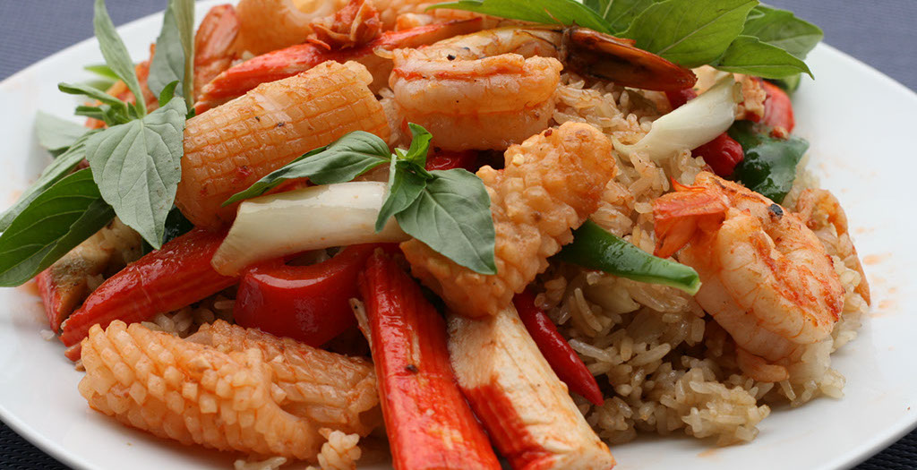 Fried rice with seafood, ground chili garlic, basil leaves, bell