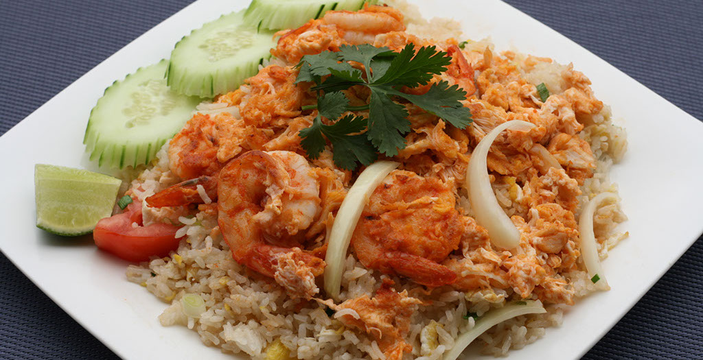 Crab meat with shrimps, onion, tomato and eggs mixed with rice.
