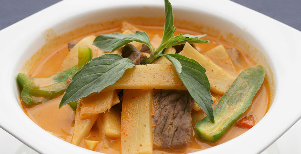Red curry paste with coconut milk bamboo shoot, bell pepper, jalapeno, and basil leaves.