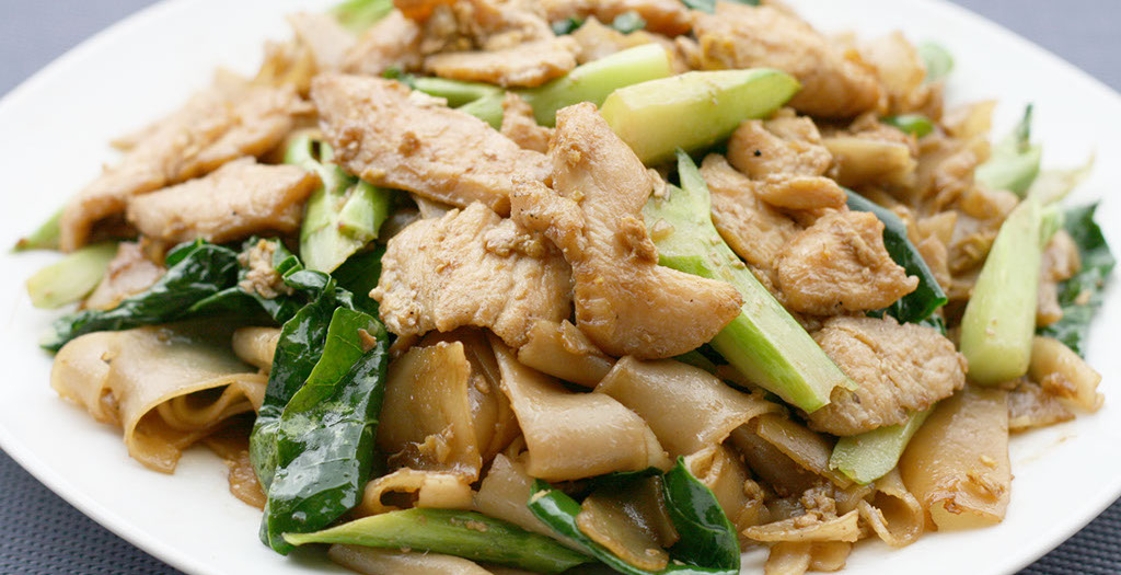 Sauteed meat, Chinese broccoli and gravy over stir fried flat rice noodle.