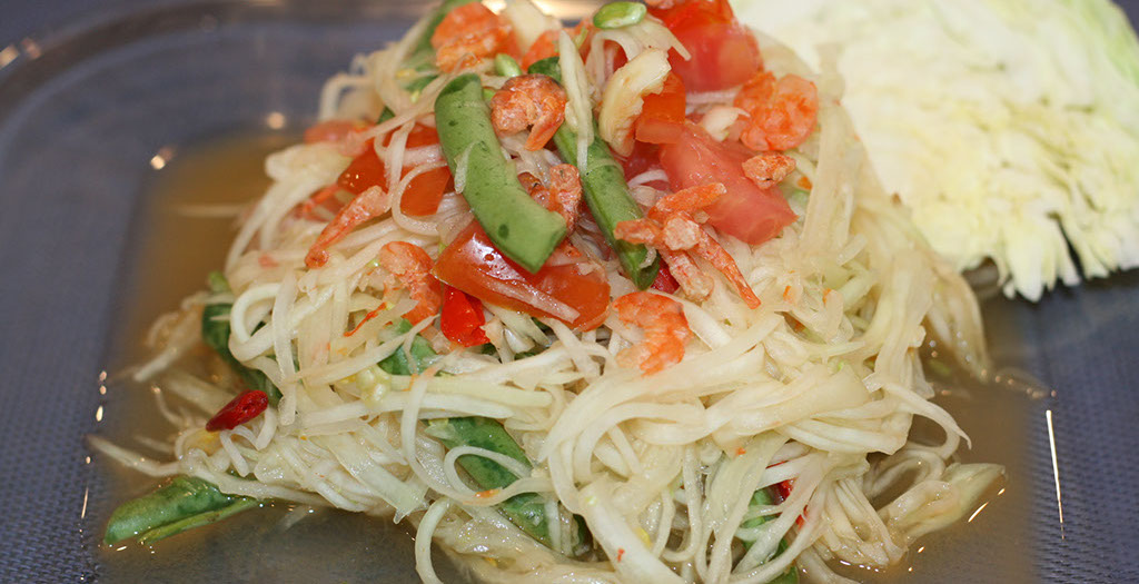Green papaya mixed with garlic tomato, green beans, dried shrimp mixed with ground chili and lime juice.