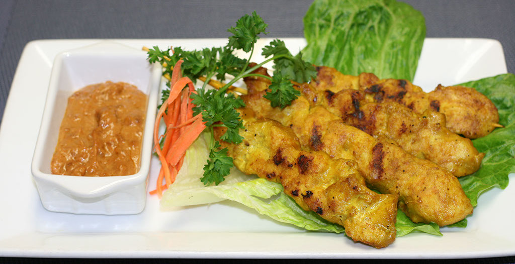 chicken seasoned marinated in coconut milk braised served with peanut sauce and cucumber salad.