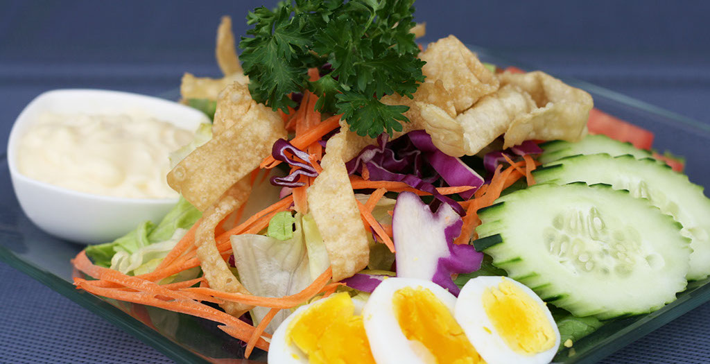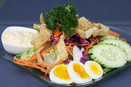 Romaine, cucumber, tomato, red onion, boiled egg, crispy noodle served with home-made dressing.