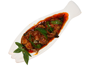Crispy cat-fish with bell pepper, jalapeno, basil leaves and chili paste.