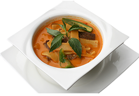 Red curry paste with coconut milk bamboo shoot, bell pepper, jalapeno, and basil leaves.