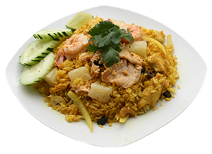 Fried rice with chicken shrimp, raisins, pineapple. roasted
