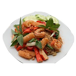 Fried rice with seafood, ground chili garlic, basil leaves, bell