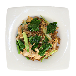 Sauteed meat, Chinese broccoli and gravy over stir fried flat rice noodle.