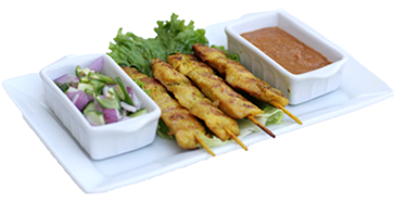 chicken seasoned marinated in coconut milk braised served with peanut sauce and cucumber salad.