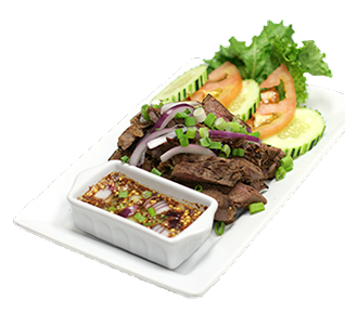 Grilled sliced beef, onions, cucumbers, tomatoes with